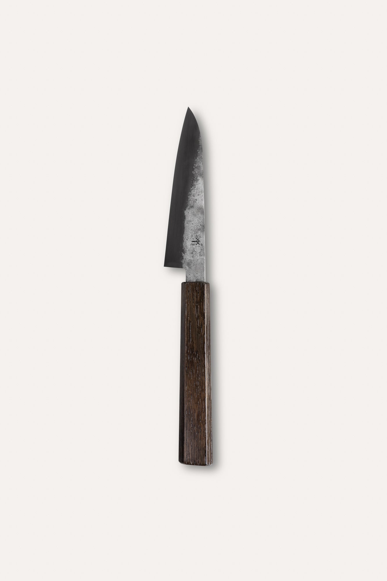The knife has a slight convex grind that aids significantly in food release and is nicely thin behind the edge, making the knife cut effortlessly. The edges are shaped on a belt grinder and have a fine hand finish before etching.